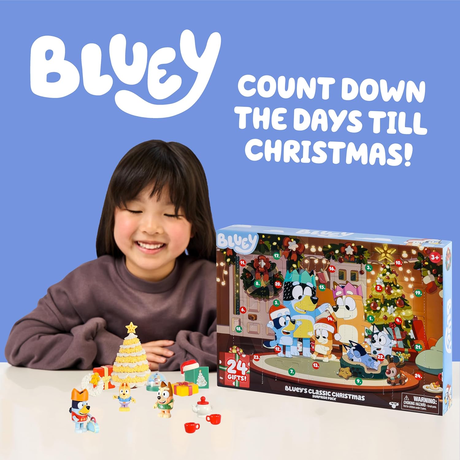 Figuras exclusivas: este calendario de Adviento para niños incluye figuras de juguete de Bluey, Bingo y Bartlebee, con Bluey y Bingo vestidos con sus suéteres navideños favoritos para divertirse festivamente