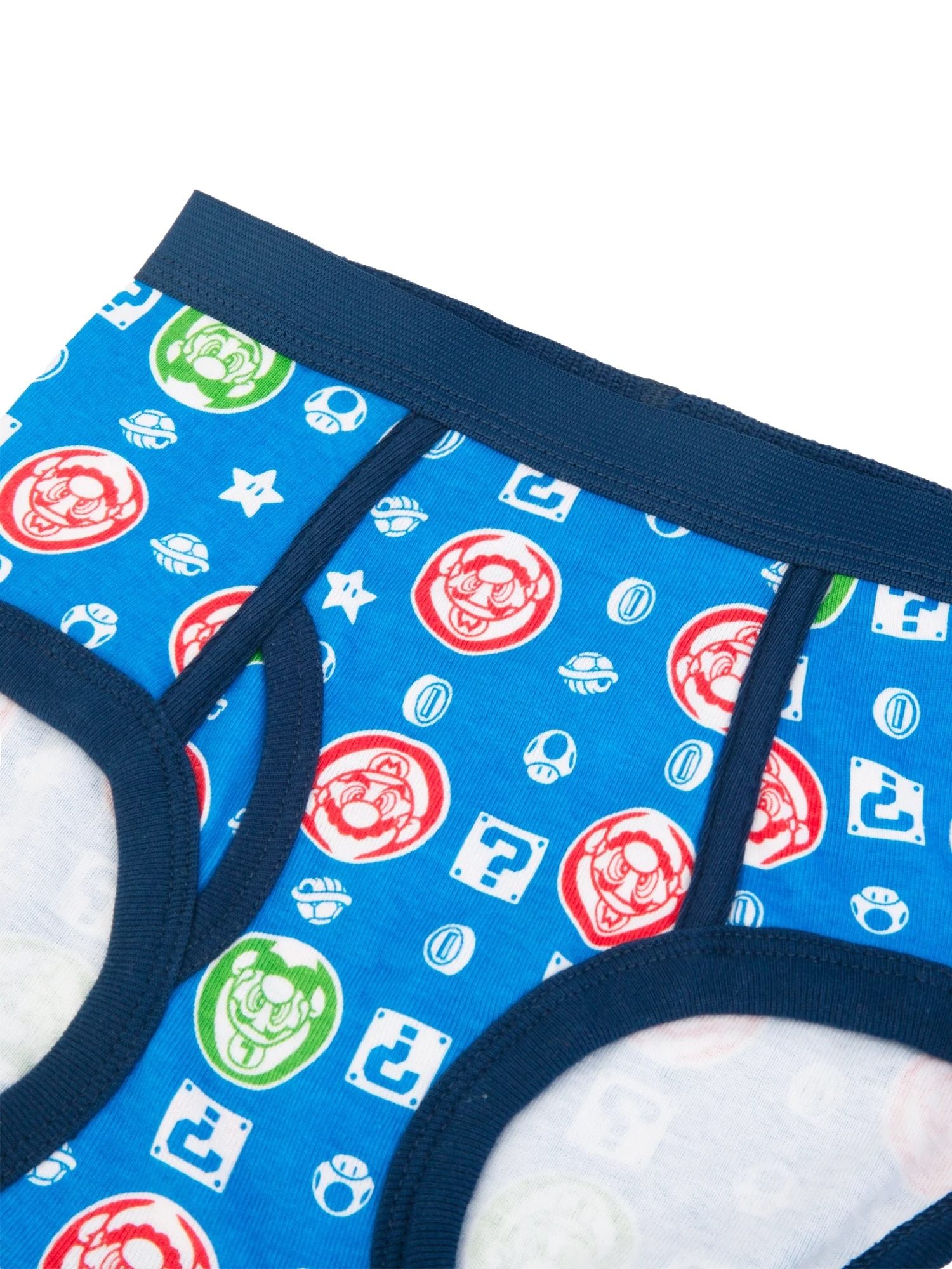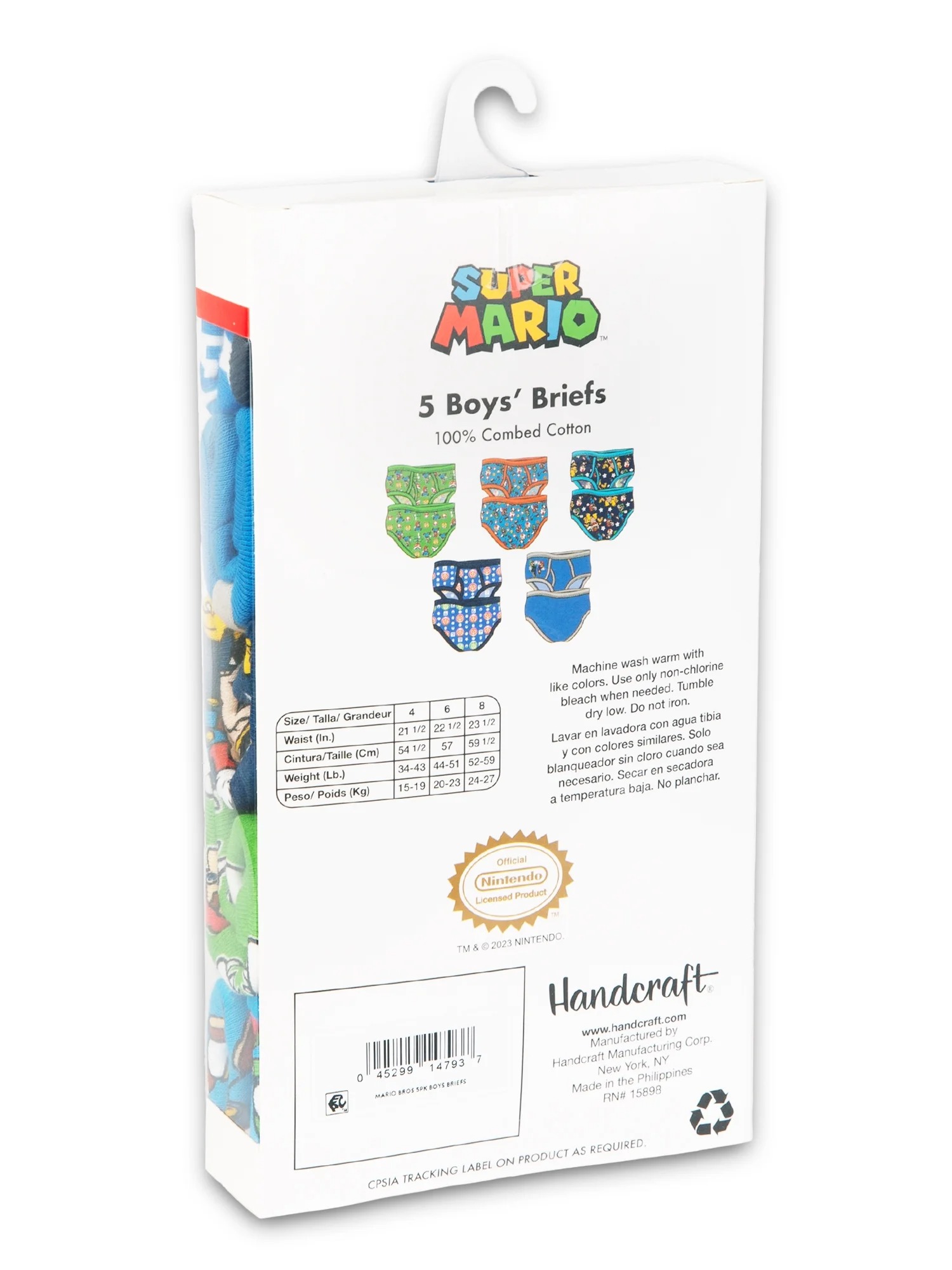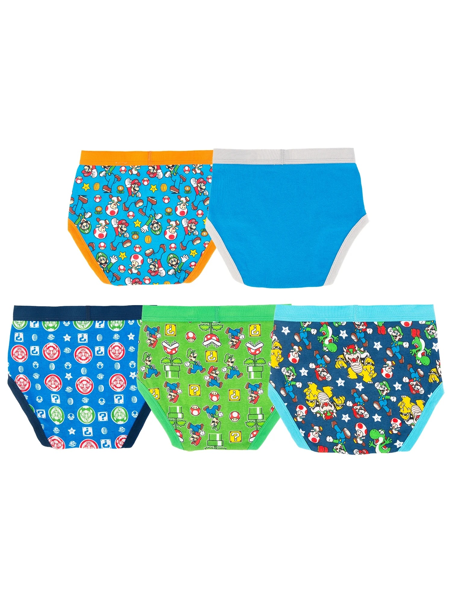 Niños Mario Brothers 5 pack calzoncillos Hecho de algodón peinado con cintura elástica para mayor comodidad. Sin etiquetas para mayor comodidad. Presenta personajes de Mario Brothers en diseños divertidos y coloridos.