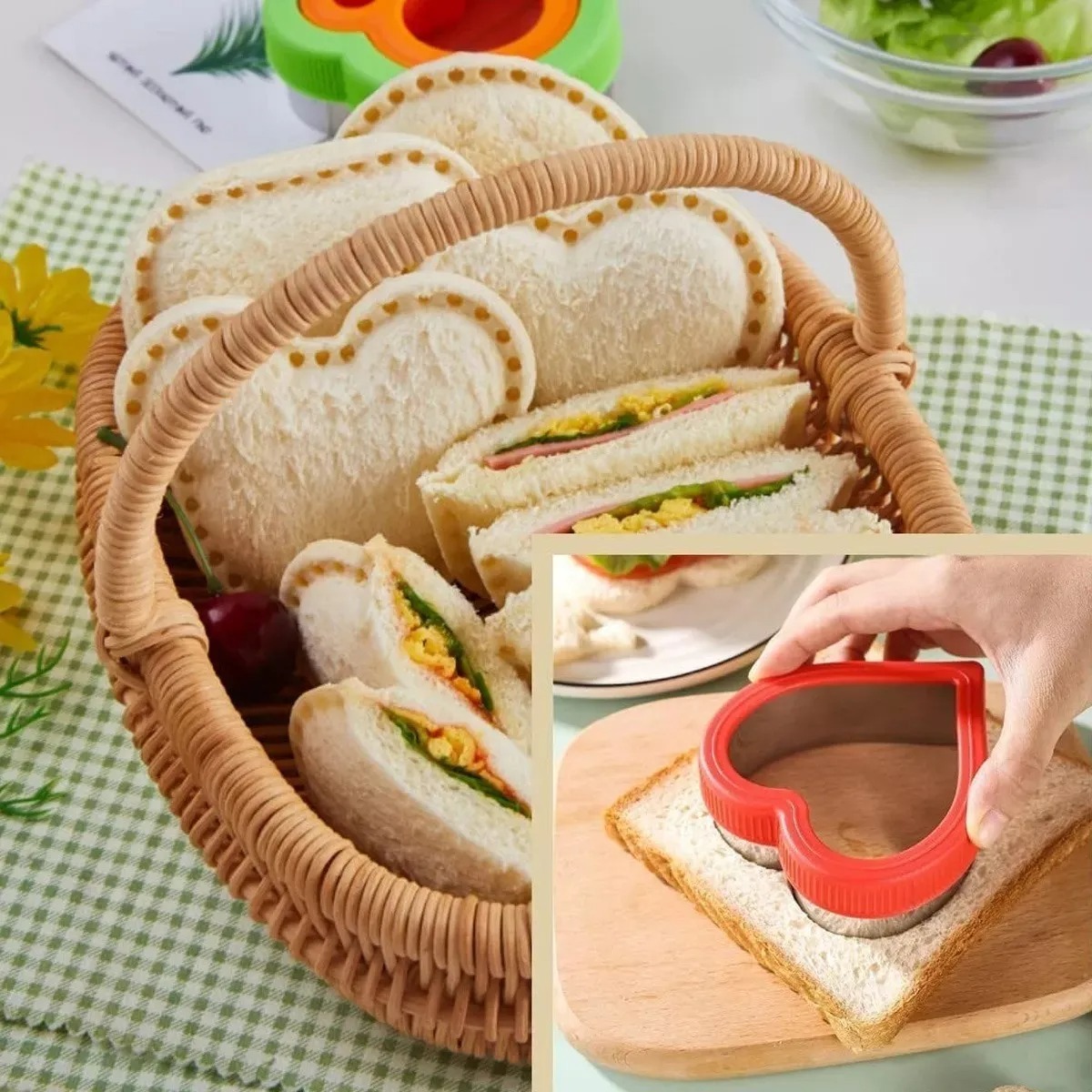 Inlcuye: Cortadores para sandwiche,cortadores pequeños de frutas/verduras y palillos para frutas