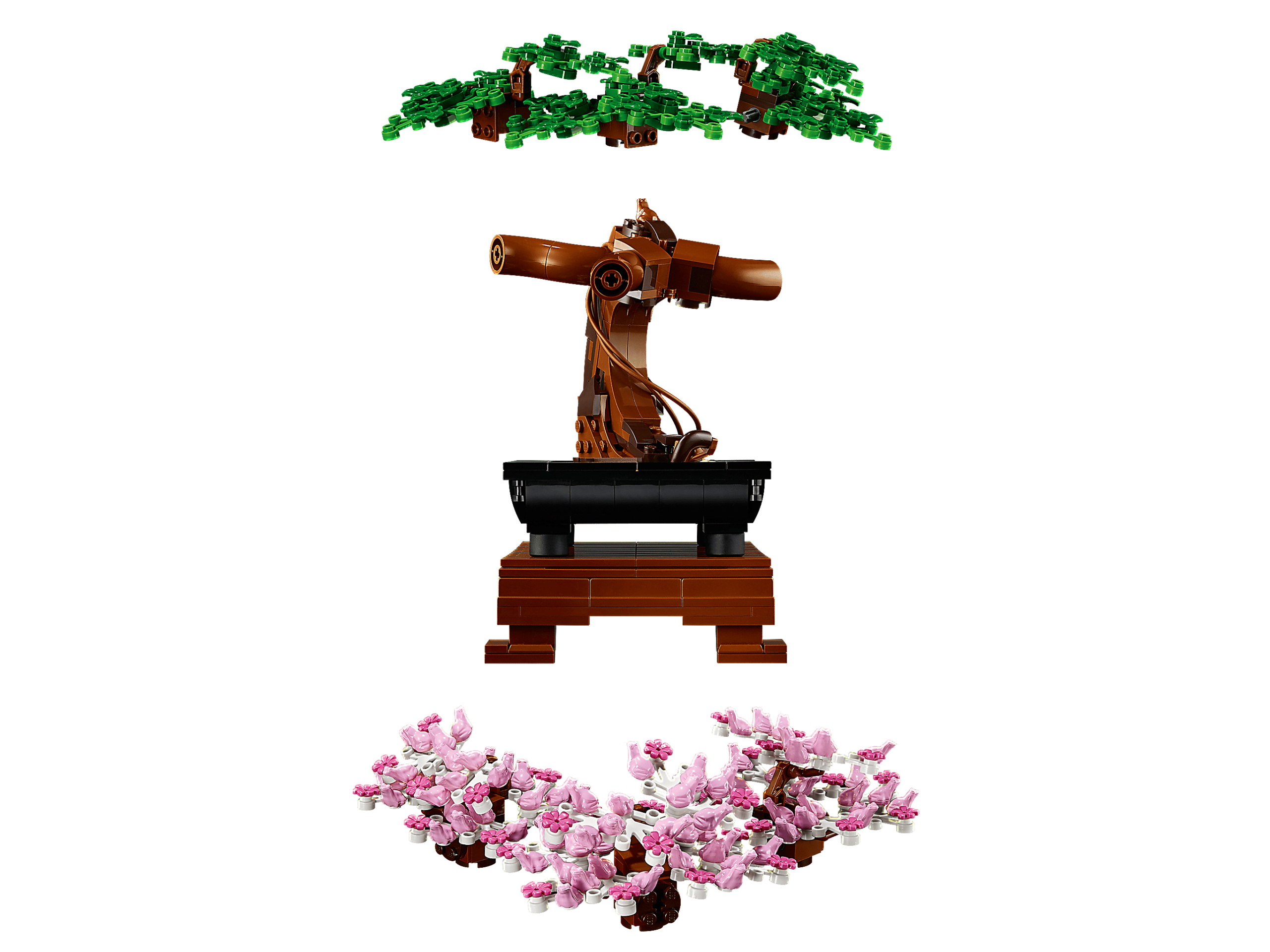 El arte de cultivar bonsáis ha cautivado a los amantes de los árboles y dado alas a su imaginación durante siglos. Ahora puedes rendir homenaje a este arte milenario con el kit de construcción de maqueta LEGO® Bonsái. Disfruta de una agradable sensación de calma mientras das forma delicadamente a tu Bonsái de hojas verdes o flores de cerezo rosas. Cuando te sientas preparado para un cambio, intercambia las coloridas copas para darle un aspecto completamente nuevo. Mira de cerca las flores rosas: ¿ves las ranitas que componen cada una de ellas?