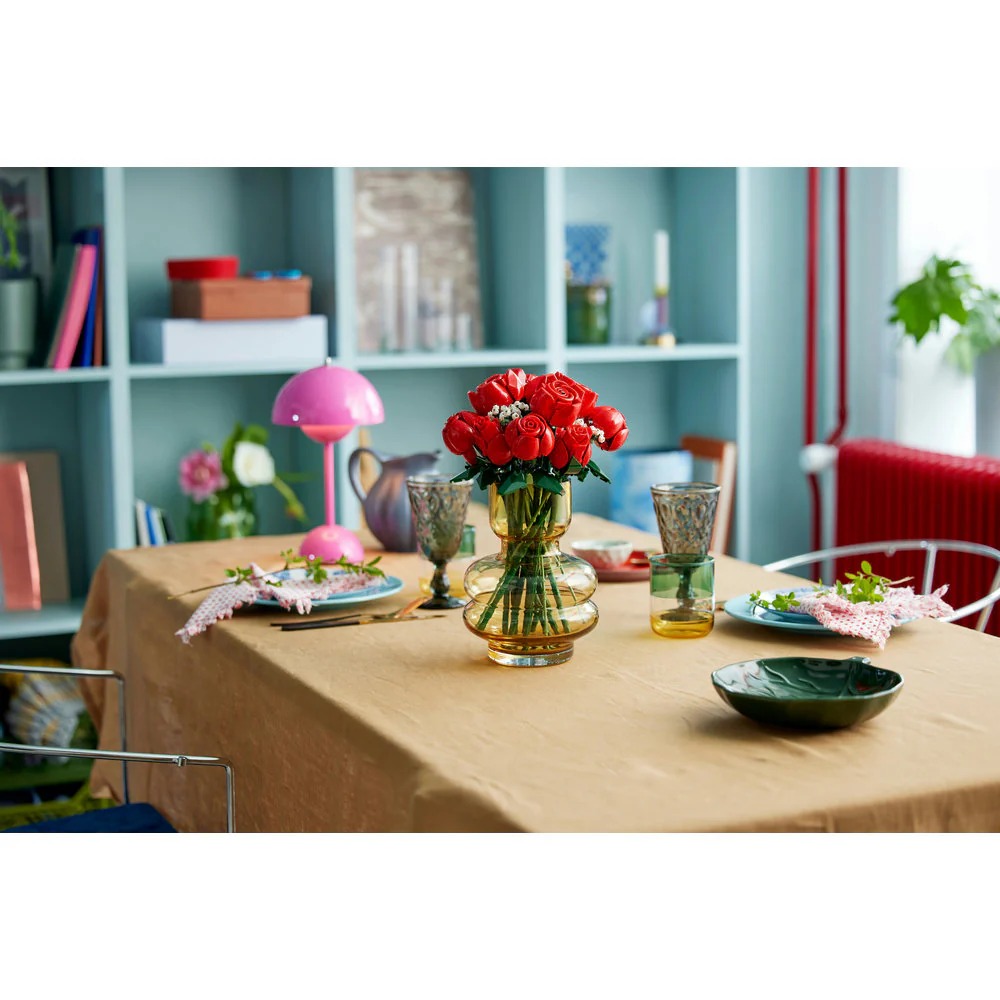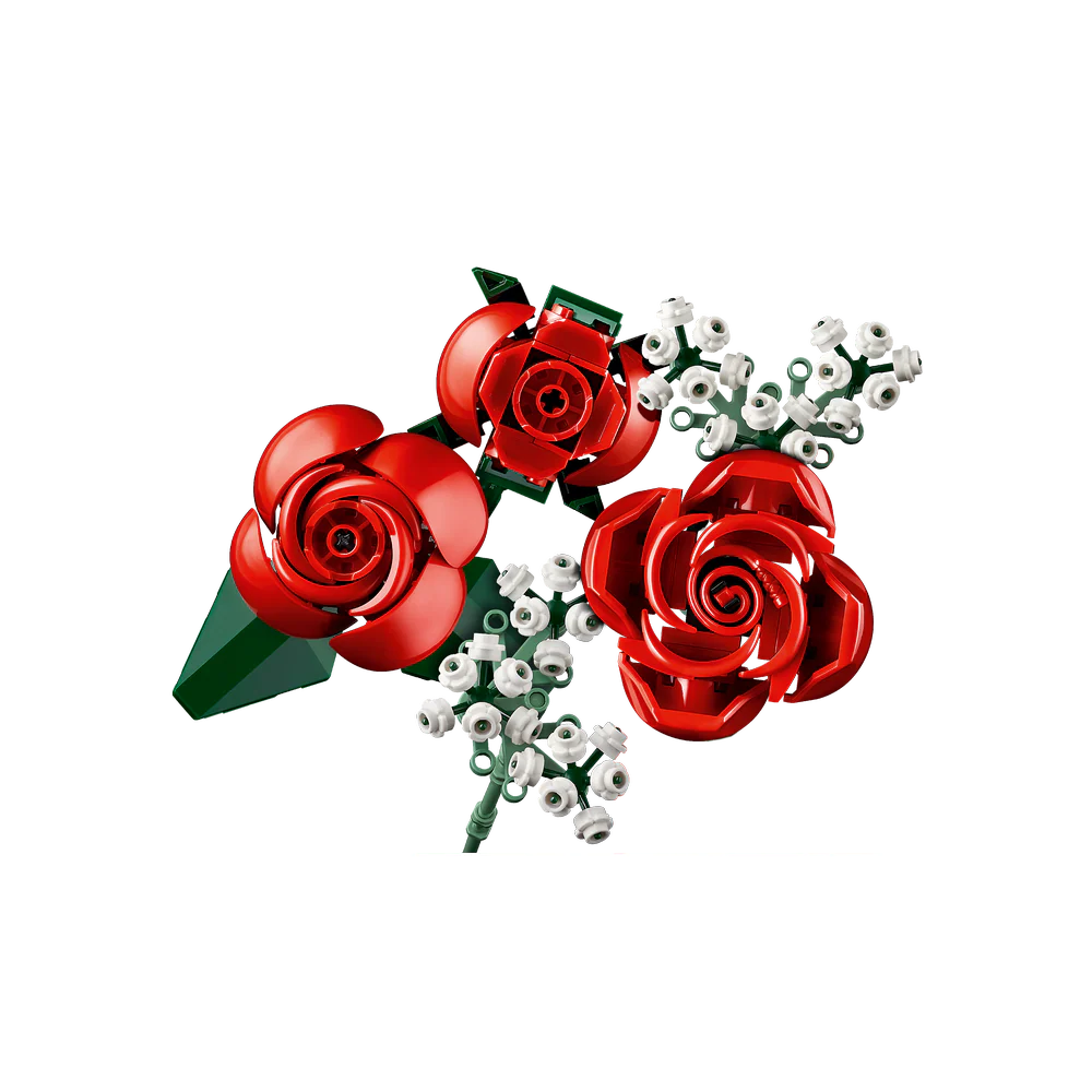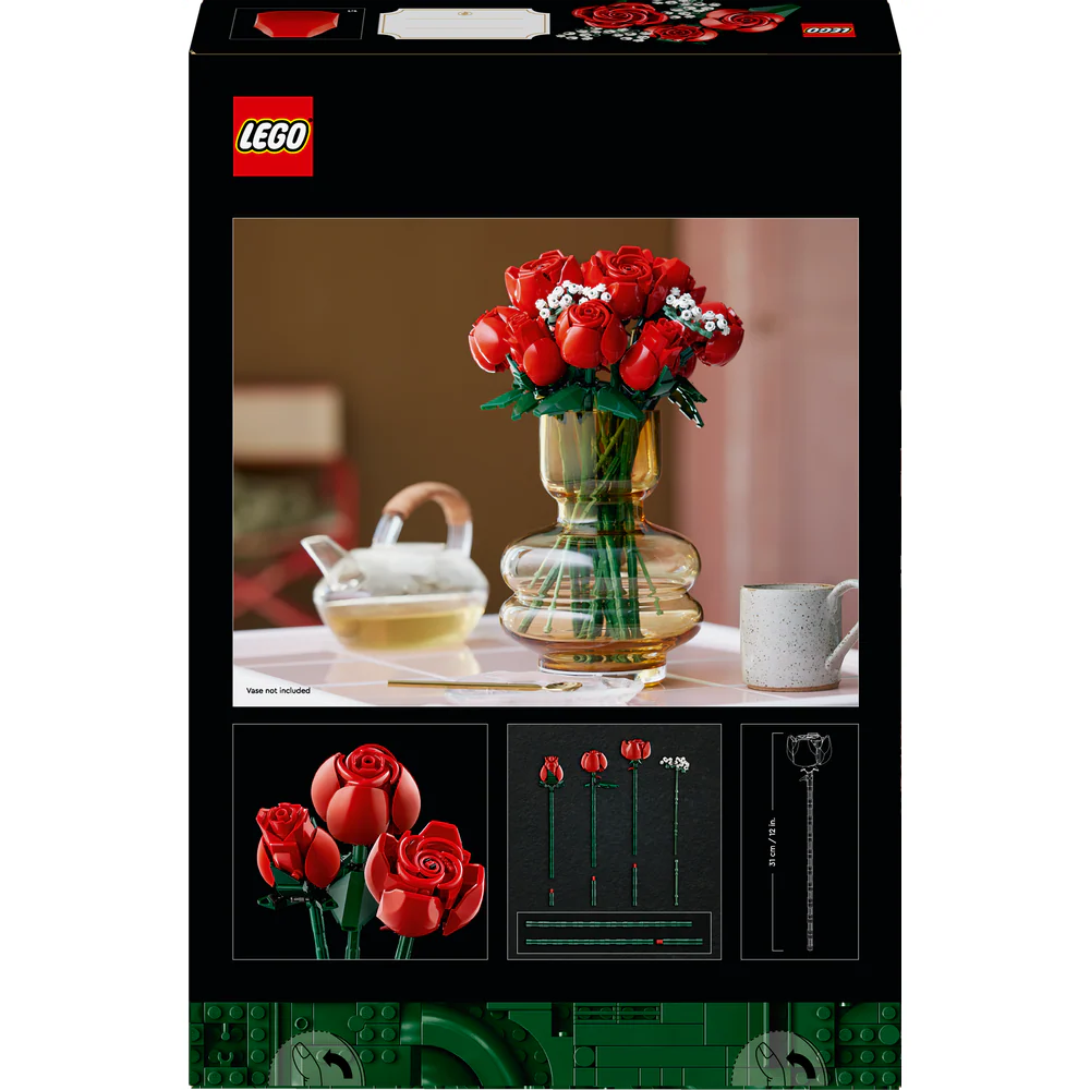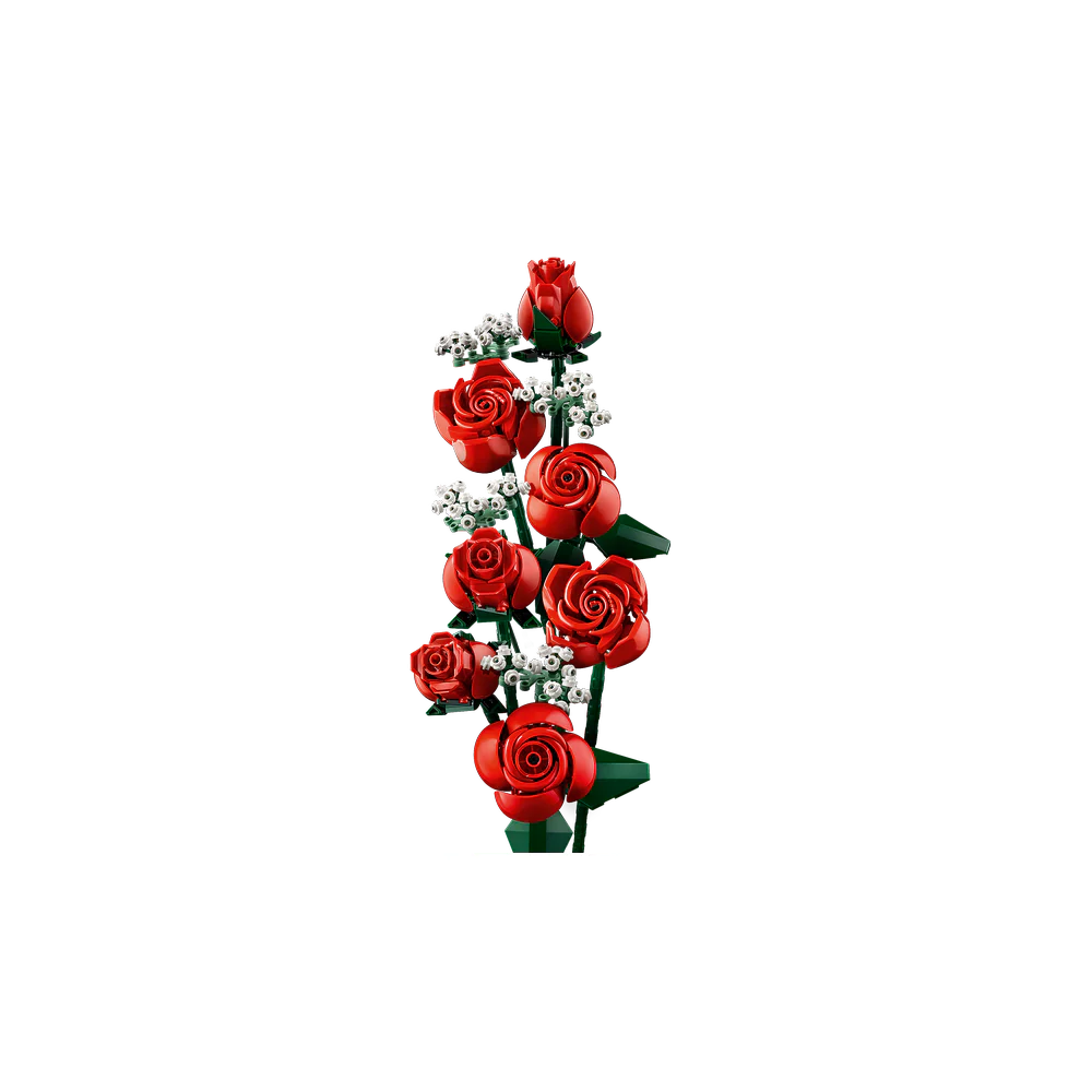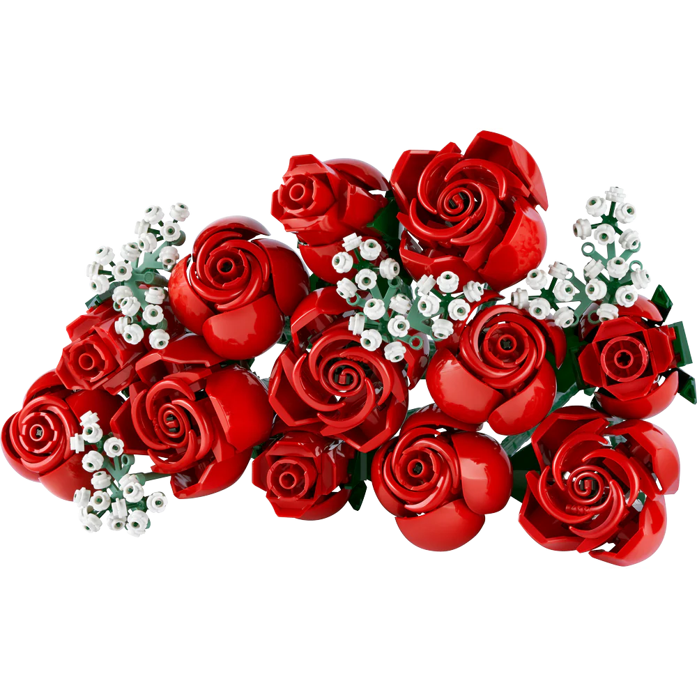 Crear este ramo LEGO es un placer. Está formado por una docena de rosas rojas (4 abiertas, 4 abriéndose y 4 aún en capullo) con largos tallos verdes para colocarlas en un jarrón, además de 4 ramitas de velo de novia con florecitas blancas. Fácil de construir, el ramo adornará con elegancia cualquier lugar y puede combinarse con otros sets de la colección LEGO Botanical.