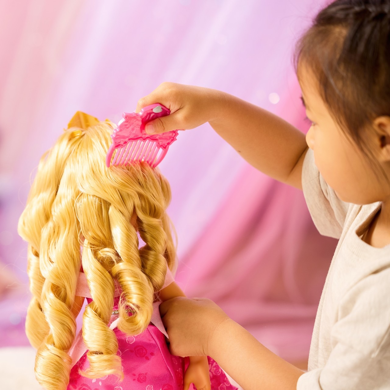 La colección Érase una vez una historia de Disney celebra el poder de la imaginación y la narración con entrañables amigos de cuentos de hadas. ¡Te esperan horas de mágicas aventuras con las historias que creas! La Princesa Aurora se reinventa como una niña pequeña, criada en el bosque por las Tres Hadas Buenas, quienes la llamaron cariñosamente Rosa de las Briars. Recién vestida con un traje rosa brillante, anticipa su regreso al trono.